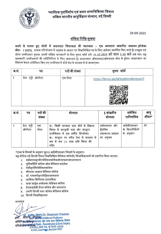 AIIMS New Delhi Vacancy 2025: All India Institute of Medical Sciences (AIIMS) New Delhi issue the AIIMS New Delhi Vacancy 2025 Offline Form for the Data Entry Operator Posts. Interested Candidate can apply through by post or by hand. All details related to AIIMS New Delhi Vacancy 2025 are given below in this post.