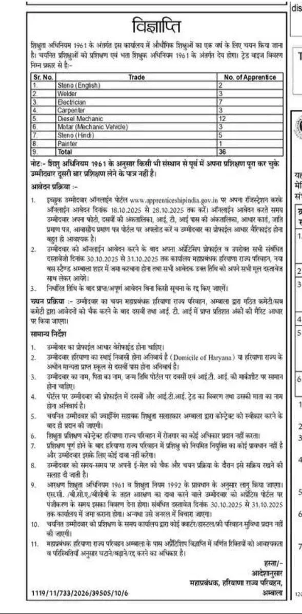 | Ambala Roadways Vacancy 2025 Official Notice | Official Notice |