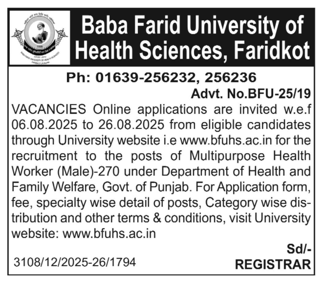 Baba Farid University Vacancy 2025: BFUHS (Baba Farid University of Health Sciences) Faridkot issue the Baba Farid University Jobs Online Form 2025 for Multi Purpose Health Worker posts. Interested Candidate can apply through Official Website. All details related to Baba Farid University MHW Vacancy 2025 are given below in this post.