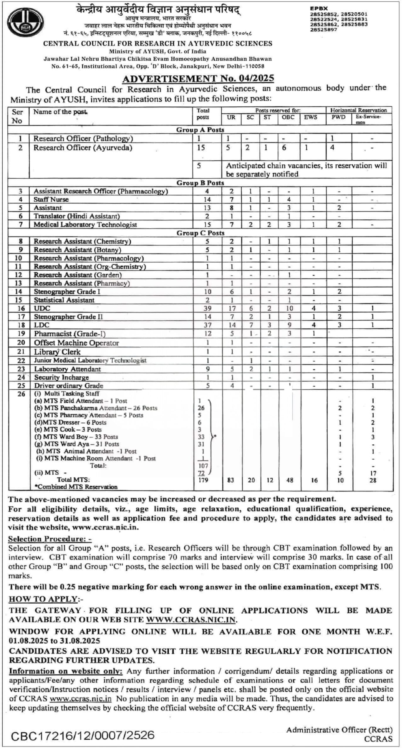 CCRAS Vacancy 2025 : The Central Council for Research in Ayurvedic Sciences (CCRAS) issue the CCRAS Jobs Online Form 2025 for Various Group A, B, C posts. Interested Candidate can apply through Official Website. All details related to CCRAS Vacancy Online Form 2025 are given below in this post.