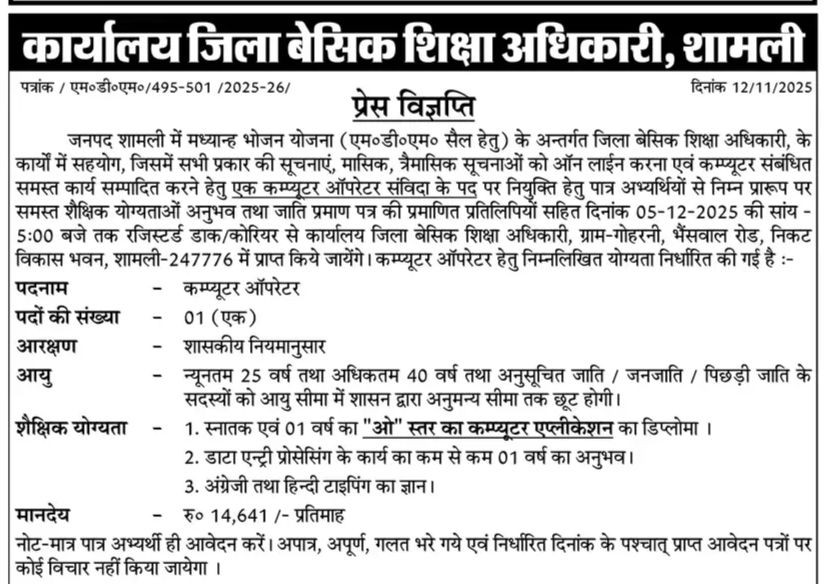 | DBEO Office Shamli Vacancy 2025 Notice | Official Notice |