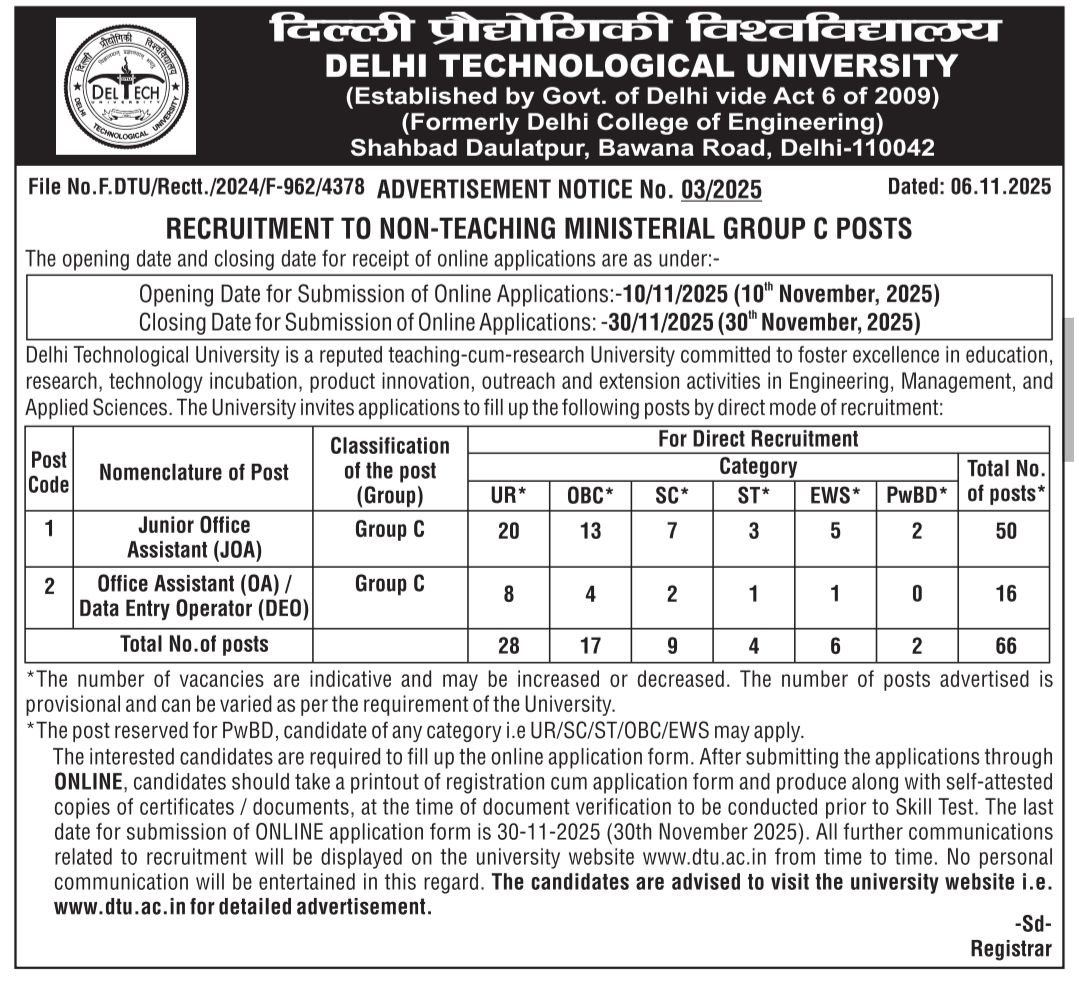 Delhi Technological University Vacancy 2025: Delhi Technological University issue the Delhi Technological University Vacancy Offline Application form for Junior Office Assistant (JOA), and Office Assistant (OA)/ Data Entry Operator (DEO) posts. Interested Candidate can apply through Sending/ Submitting their application form via By Post or By Hand. All details related to Delhi Technological University Recruitment 2025 are given below in this post.