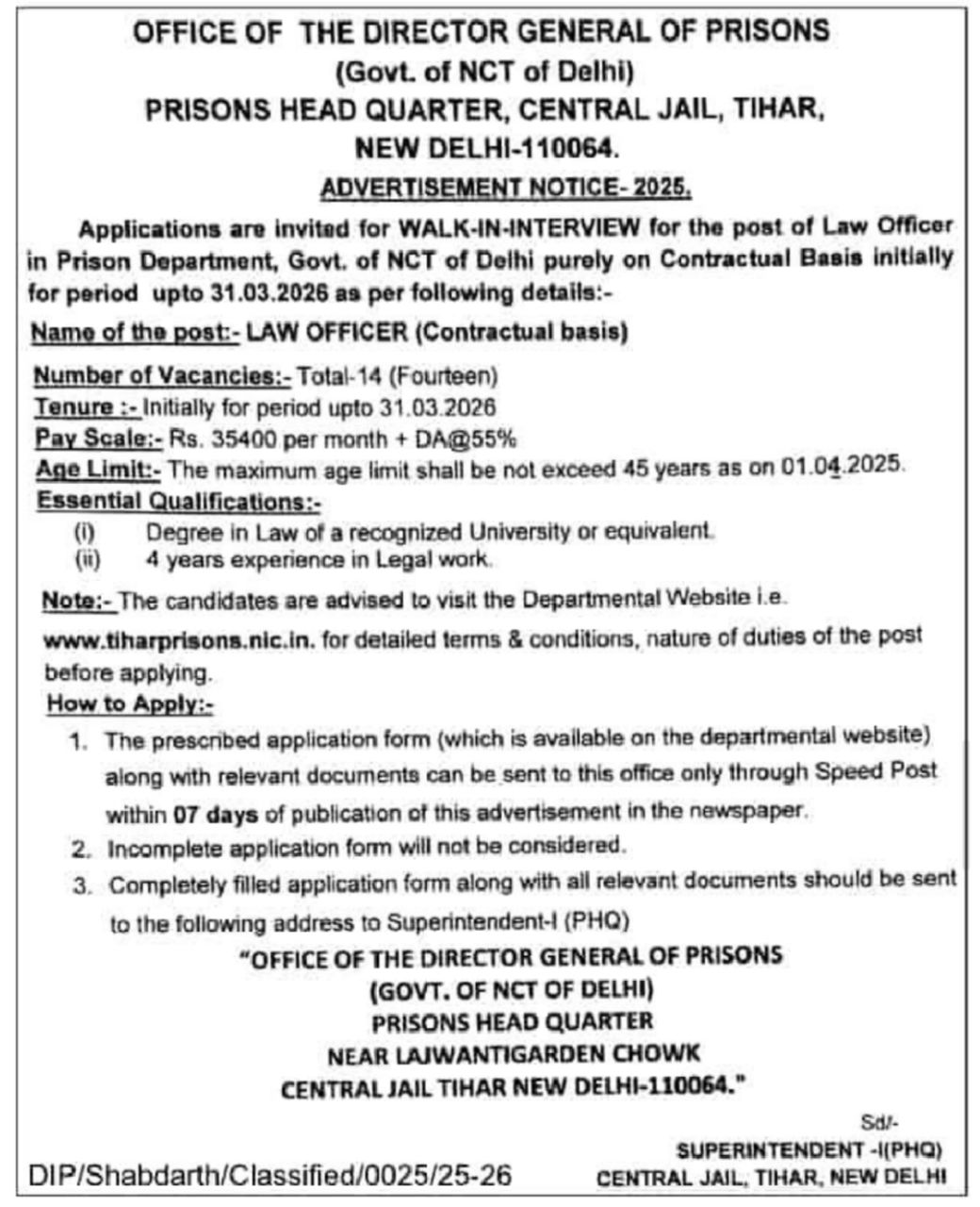 Delhi Tihar Jail Vacancy 2025: Tihar Prisons Department Delhi issued the latest notification for the post of Law Officer. Interested Candidate can apply through Sending/ Submitting their application form via By Post or By Hand. All details related to Delhi Tihar Jail Vacancy 2025 are given below in this post.
