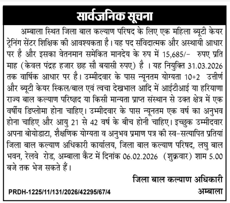 District Child Welfare Council Ambala Vacancy 2026 : District Child Welfare Office, Ambala issued the latest notification for the post of Beauty Care Training Center Teacher. Interested Candidate can apply through Sending/ Submitting their application form via By Post or By Hand. All details related to District Child Welfare Council Ambala Vacancy 2026 are given below in this post.