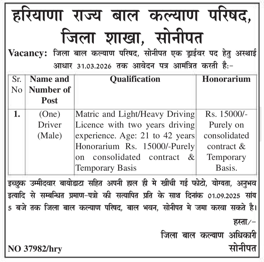 District Child Welfare Council Sonipat Vacancy 2025 : District Child Welfare Council, Sonipat issued the latest notification for the post of Driver. Interested Candidate can apply through Sending/ Submitting their application form via By Post or By Hand. All details related to District Child Welfare Council Sonipat Recruitment 2025 are given below in this post.