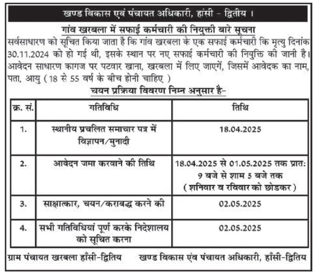 Hansi Safai Karamchari Vacancy 2025: Office of Block Development & Panchayat Department, Hansi issue the Hansi Safai Karamchari Vacancy Offline Application form for Safai Karamchari posts in 1 Village. Interested Candidate can apply through Submitting their application form via By Hand. All details related to Hansi Safai Karamchari Vacancy 2025 are given below in this post.