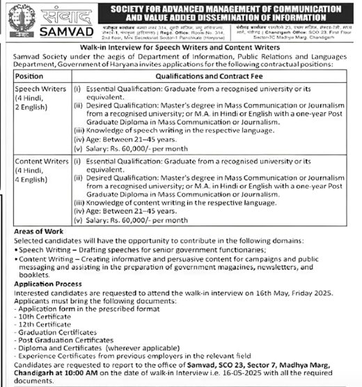 Haryana SAMVAD Society Vacancy 2025: Society for Advanced Management of Comm. & Value Added Dissemination of Information (Samvad Society), under the aegis of Department of Information, Public Relations and Languages, Haryana Chandigarh issue the Haryana SAMVAD Society Jobs Walk in interview notice for Speech Writer and Content Writer posts. Interested Candidate can apply through walk in interview. All details related to Haryana SAMVAD Society Vacancy 2025 are given below in this post.