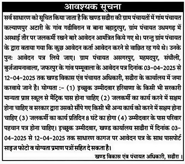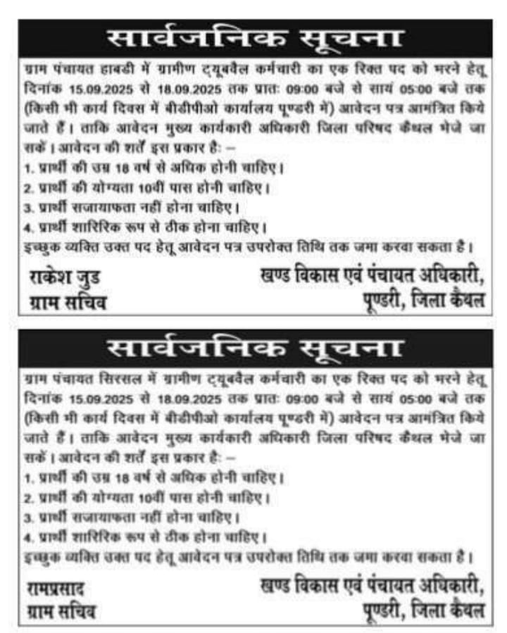 | Haryana Tubewell Operator Vacancy Notice | Official Notice |
