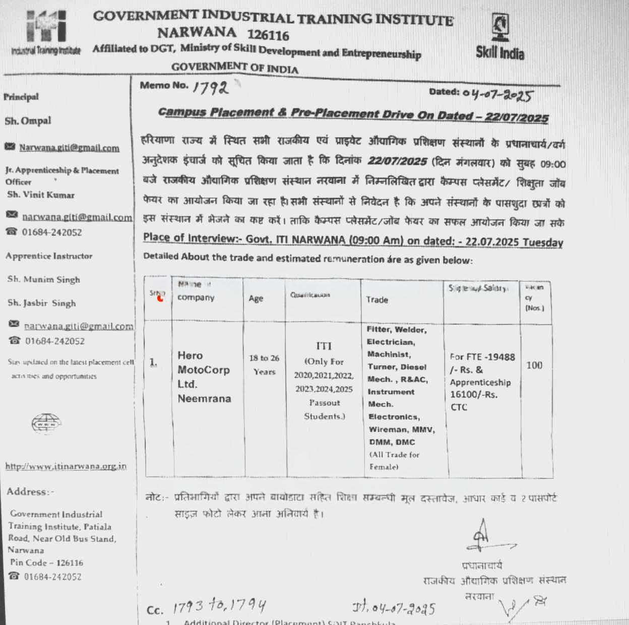 | Interview Place | Govt. ITI Narwana, Jind, Haryana |