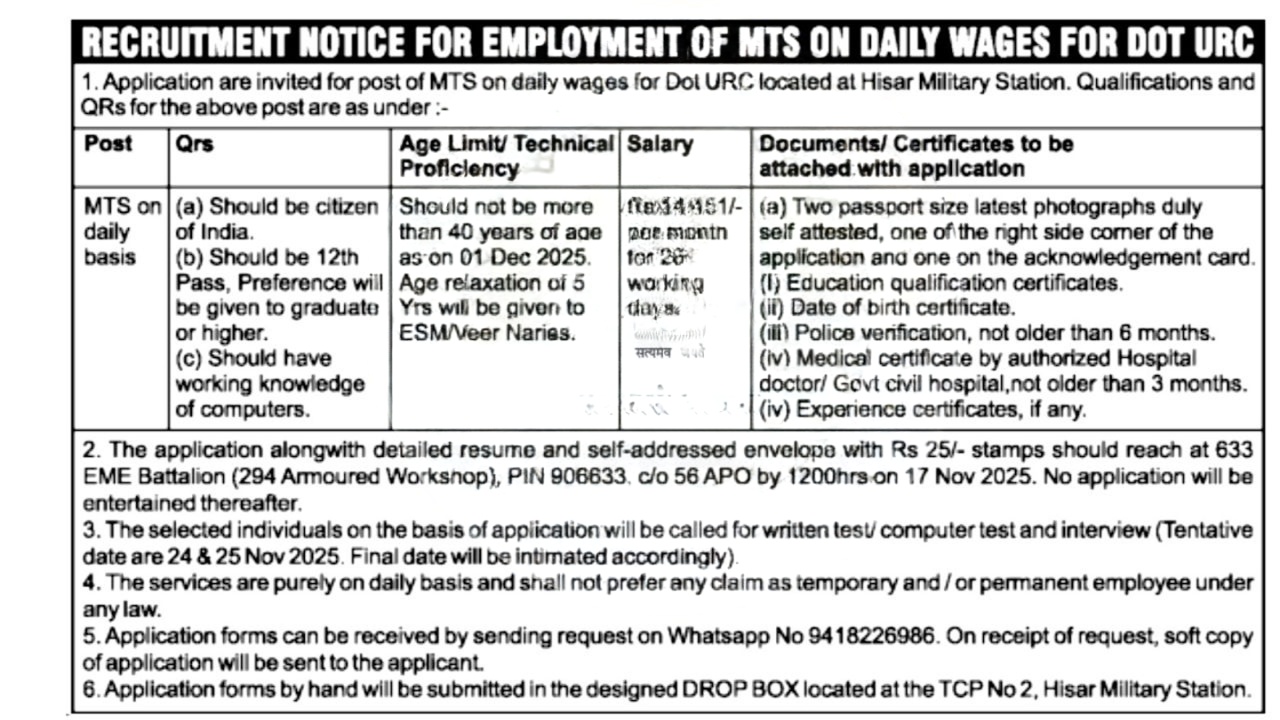 Hisar Military Canteen Vacancy 2025 : DOT URC Canteen Hisar Military Station issued the latest notification for the post of Multi Tasking Staff. Interested Candidate can apply through Sending/ Submitting their application form via By Post or By Hand. All details related to Hisar Military Canteen Recruitment 2025 are given below in this post.