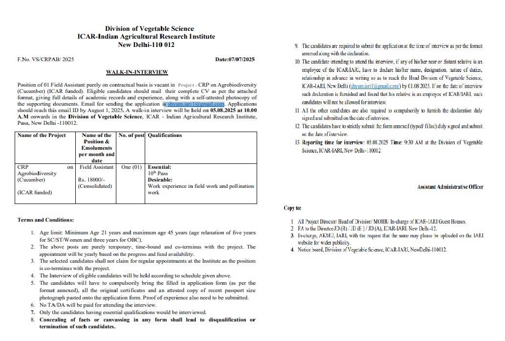 ICAR IARI Delhi Vacancy 2025: The ICAR-Indian Agricultural Research Institute (ICAR-IARI) issue the ICAR IARI Delhi jobs Online Application form for Field Assistant posts. Interested Candidate can apply through submitting their application form at walk in interview. All details related to ICAR Delhi New Jobs 2025 are given below in this post.