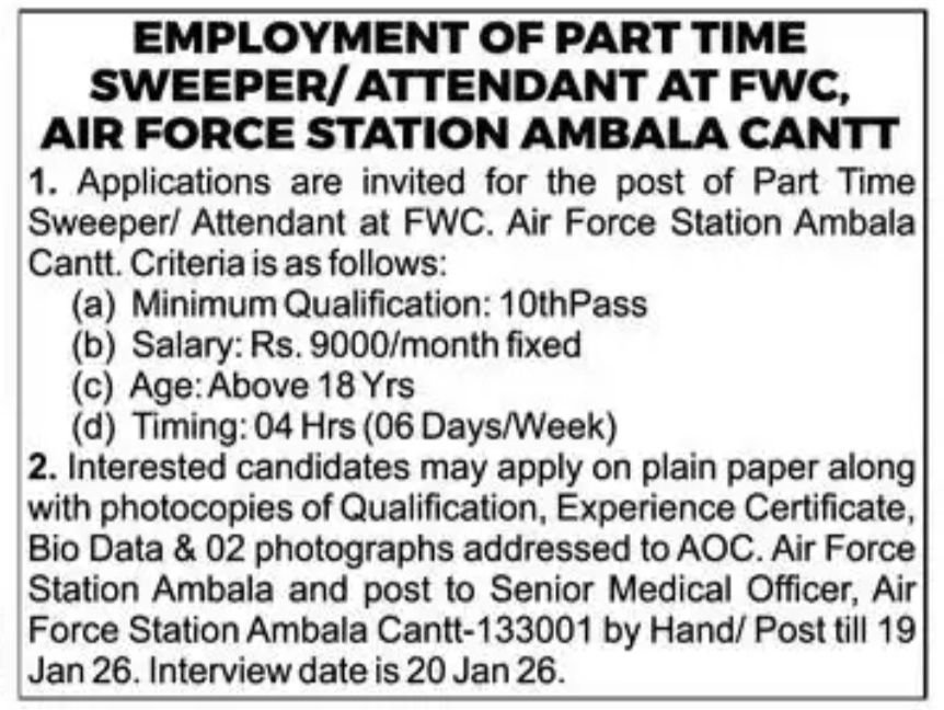 Indian Air Force Ambala Vacancy 2026: Indian Air Force Ambala issue the Indian Air Force Ambala Vacancy Offline Application form for Attendant cum Sweeper posts. Interested Candidate can apply through Sending/ Submitting their application form via By Post or By Hand. All details related to Indian Air Force Ambala Recruitment 2026 are given below in this post.