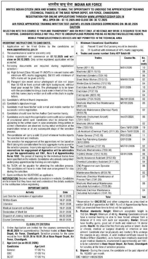 Indian Air Force Chandigarh Vacancy 2025: Indian Air Force Chandigarh issue the Indian Air Force Chandigarh Jobs Online Form 2025 for Apprentice posts. Interested Candidate can apply through Official Website. All details related to Indian Air Force Chandigarh Vacancy 2025 are given below in this post.