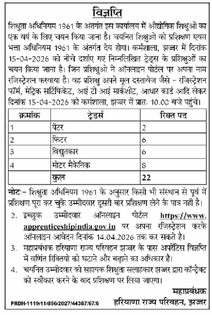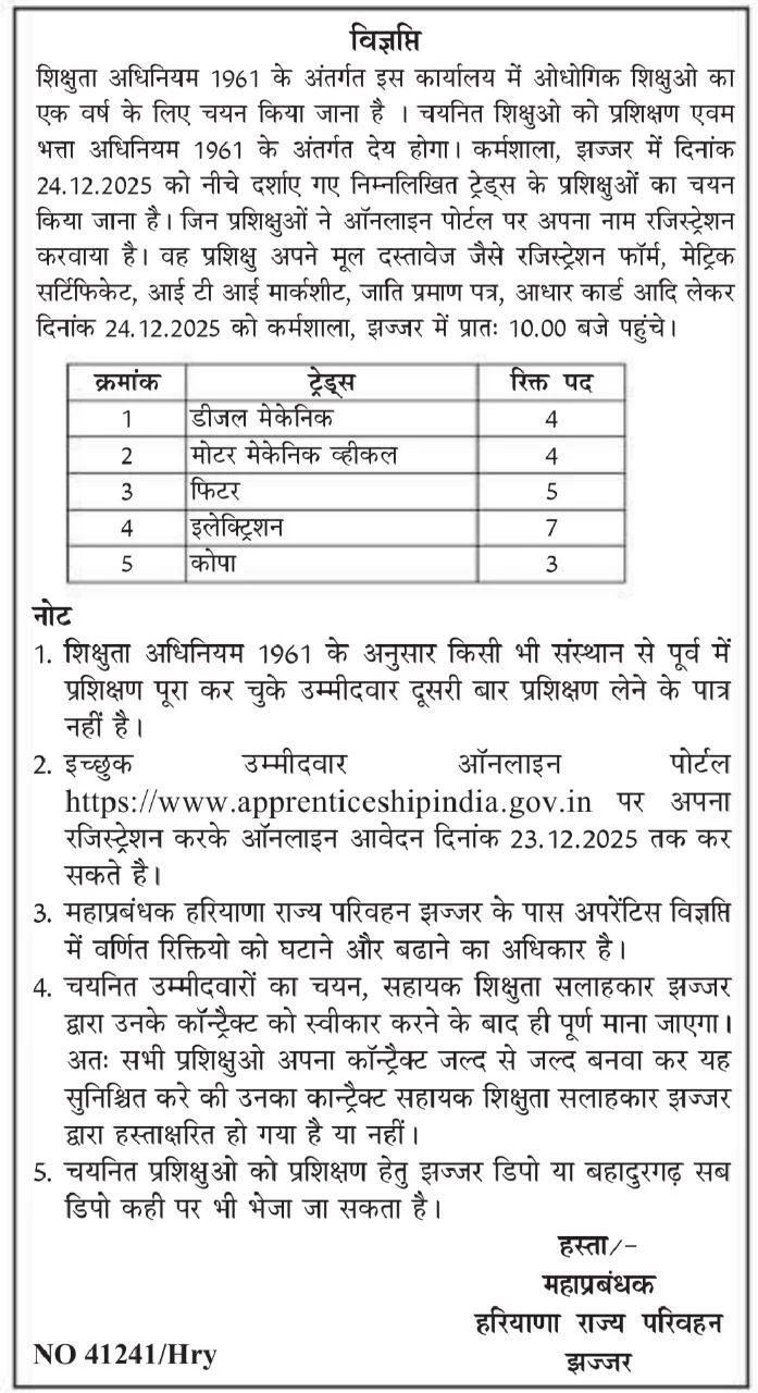 Jhajjar Roadways Vacancy 2025: General Manager Haryana Roadways, Jhajjar issue the Jhajjar Roadways Vacancy 2025 Online Application form for Painter, Fitter and other Apprentices posts in Jhajjar Roadways Workshop. Interested Candidate can apply through Submitting their application form via official website of www.apprenticeshipindia.gov.in. All details related to Jhajjar Roadways Vacancy 2025 are given below in this post.