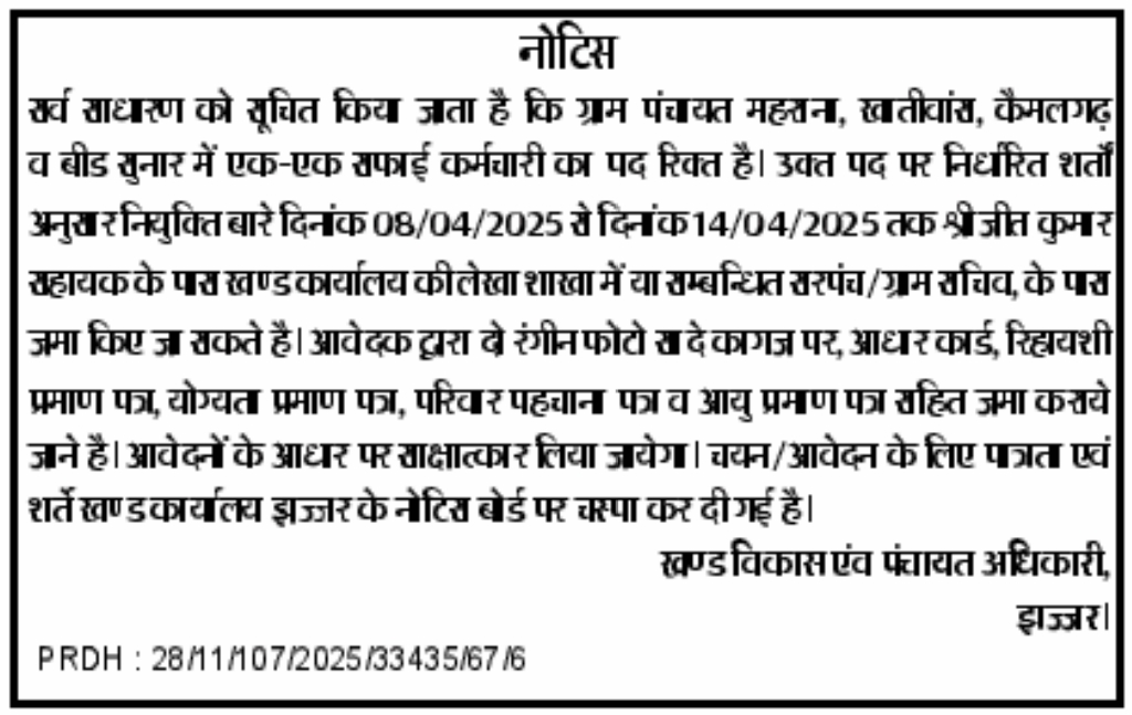 | Jhajjar Karamchari Vacancy Official Notice | Official Notice |