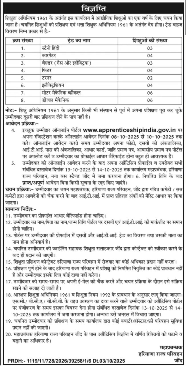 Jind Roadways Vacancy 2025 Official Notice  Official Notice