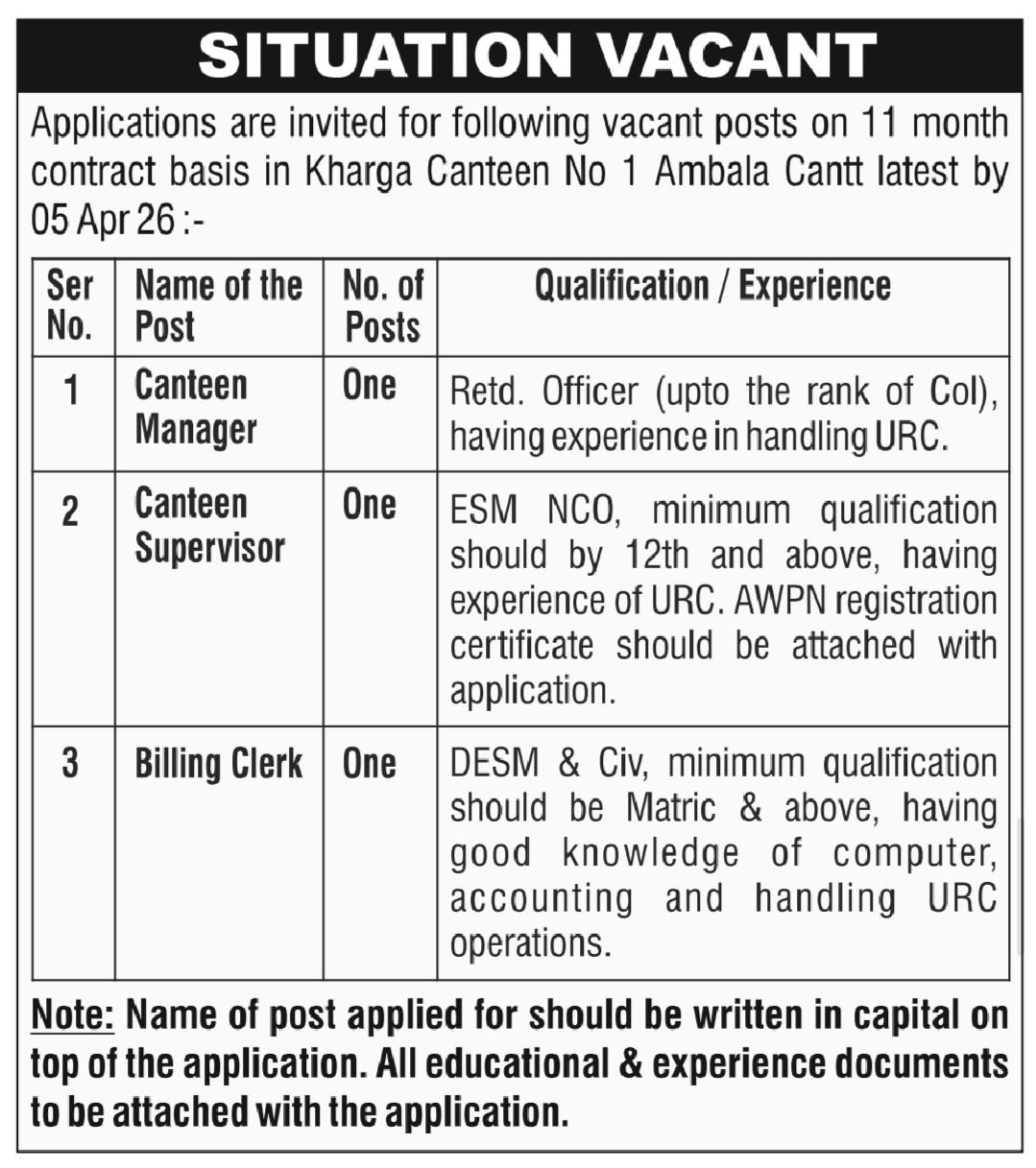 | Canteen Supervisor | ESM NCO, minimum qualification should by 12th and above, having experience of URC. AWPN registration certificate should be attached with application. |