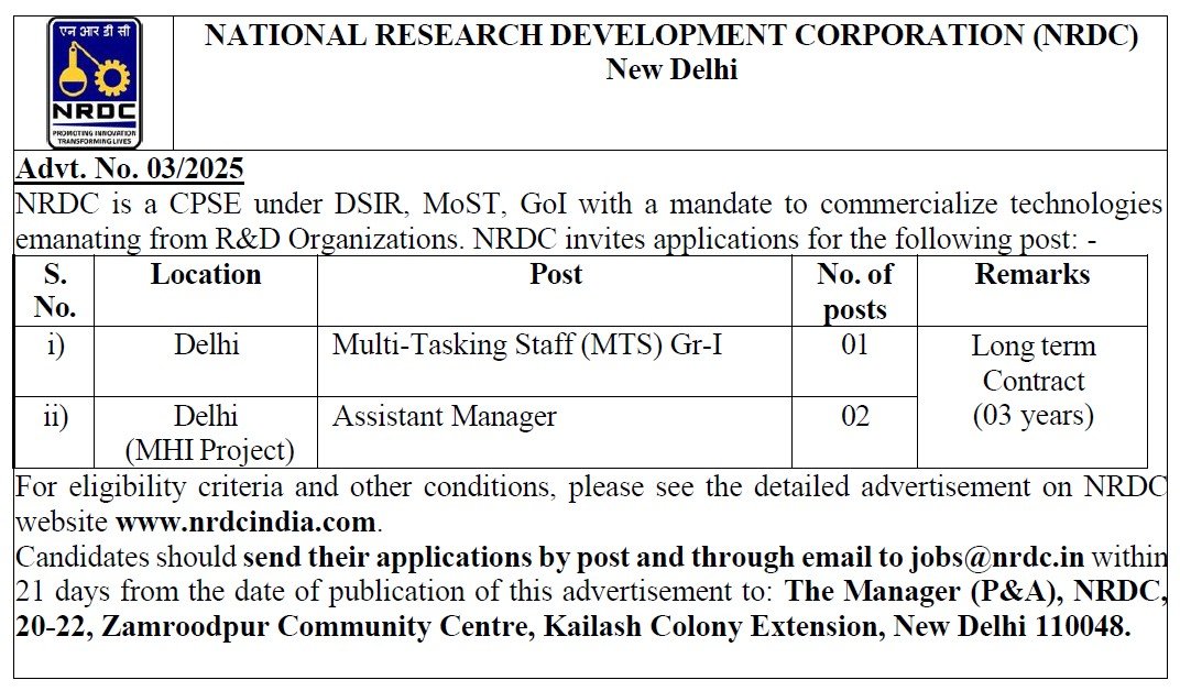 NRDC Recruitment 2025 : National Research Development Corporation issued the latest notification for the post of Multi Tasking Staff. Interested Candidate can apply through Sending/ Submitting their application form via By Post or By Email. All details related to NRDC Vacancy 2025 are given below in this post.