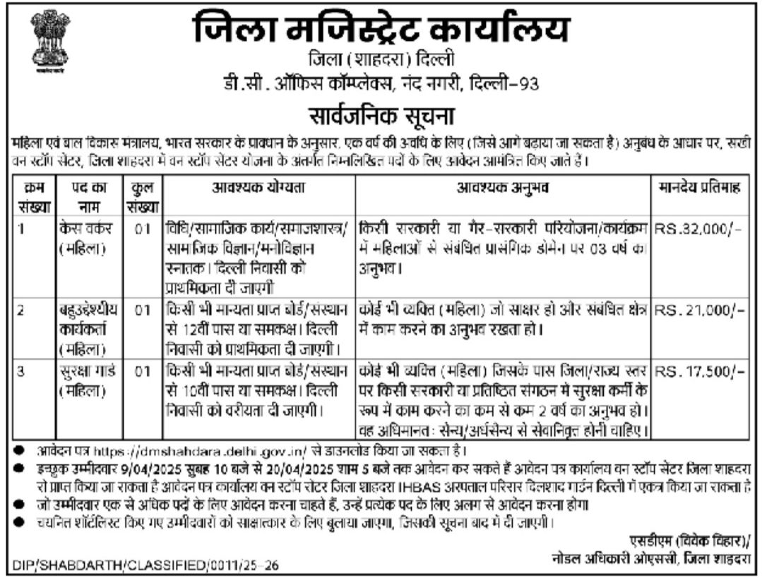 One Stop Centre Shahdara Vacancy 2025: Office of the District Magistrate, Shahdara, New Delhi issue the One Stop Centre Shahdara Vacancy 2025 for Case Worker, Multi Purpose Worker and Security Guard posts. Interested Candidate can apply through submitting their Application form by hand. All details related to One Stop Centre Shahdara Vacancy 2025 are given below in this post.