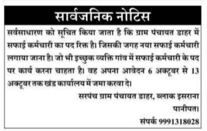 Panipat Safai Karamchari Vacancy 2025: Office of Block Development & Panchayat Department, Israna, Panipat issue the Panipat Safai Karamchari Vacancy Offline Application form for Safai Karamchari posts in Garhi Besic Village. Interested Candidate can apply through Submitting their application form via By Hand. All details related to Panipat Safai Karamchari Vacancy 2025 are given below in this post.