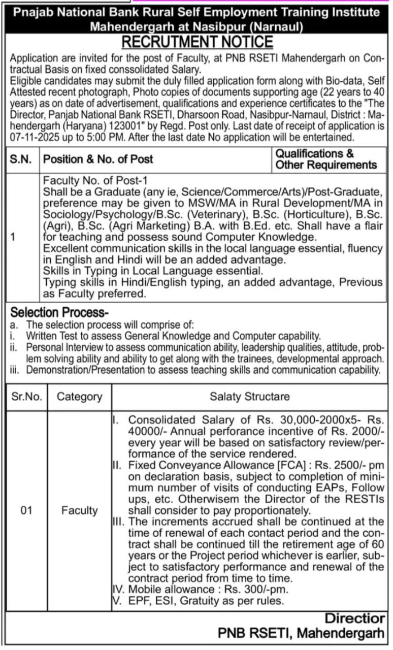 PNB Bank Mahendragarh Vacancy 2025: Punjab National Bank Rural Self Employment Training Institute, Mahendragarh issue the PNB Bank Mahendragarh Vacancy Offline Application form for Faculty posts. Interested Candidate can apply through Sending/ Submitting their application form via By Post or By Hand. All details related to PNB Bank Mahendragarh Vacancy 2025 are given below in this post.