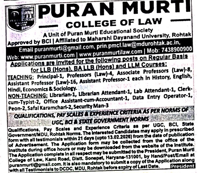 Puran Murti College Sonipat Vacancy 2026 Official Website www.puranmurti.com