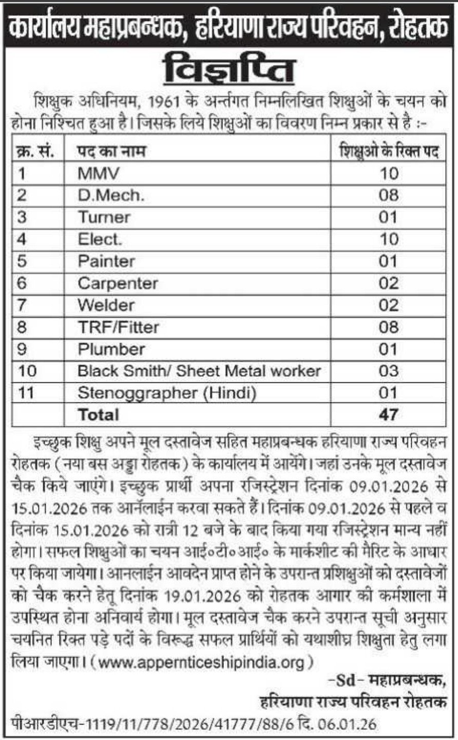 Rohtak Roadways Vacancy 2026: General Manager Haryana Roadways, Rohtak issue the Rohtak Roadways Vacancy 2026 Online Application form for various posts. Interested Candidate can apply through Submitting their application form via official website of www.apprenticeshipindia.gov.in. All details related to Rohtak Roadways Vacancy 2026 are given below in this post.