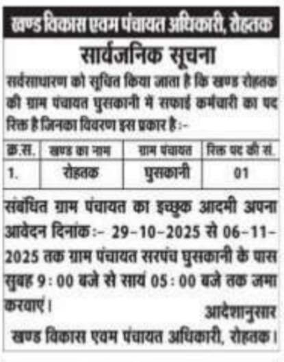 Rohtak Safai Karamchari Vacancy 2025: Office of Block Development & Panchayat Department, Rohtak issue the Rohtak Safai Karamchari Vacancy Offline Application form for Safai Karamchari posts in Ghuskani Village. Interested Candidate can apply through Submitting their application form via By Hand. All details related to Rohtak Safai Karamchari Vacancy 2025 are given below in this post.