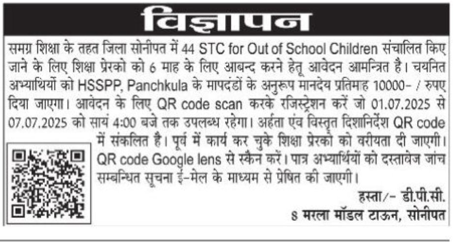 Samagra Shiksha Sonipat Vacancy 2025 Notice  Official Notice
