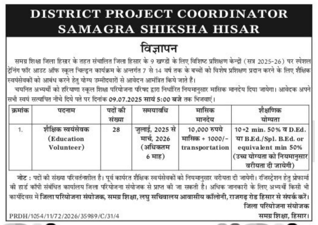Samagra Shiksha Vibhag Hisar Vacancy 2025 : Haryana School Shiksha Pariyojna Parishad issue the Samagra Shiksha Vibhag Hisar Vacancy Offline Application form for Educational Volunteers posts. Interested Candidate can apply through Sending/ Submitting their application form via By Post or By Hand. All details related to Samagra Shiksha Vibhag Hisar Recruitment 2025 are given below in this post.