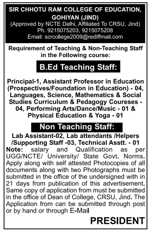 | Sir Chhotu Ram College Jind Vacancy 2025 Application Form | Application Form |