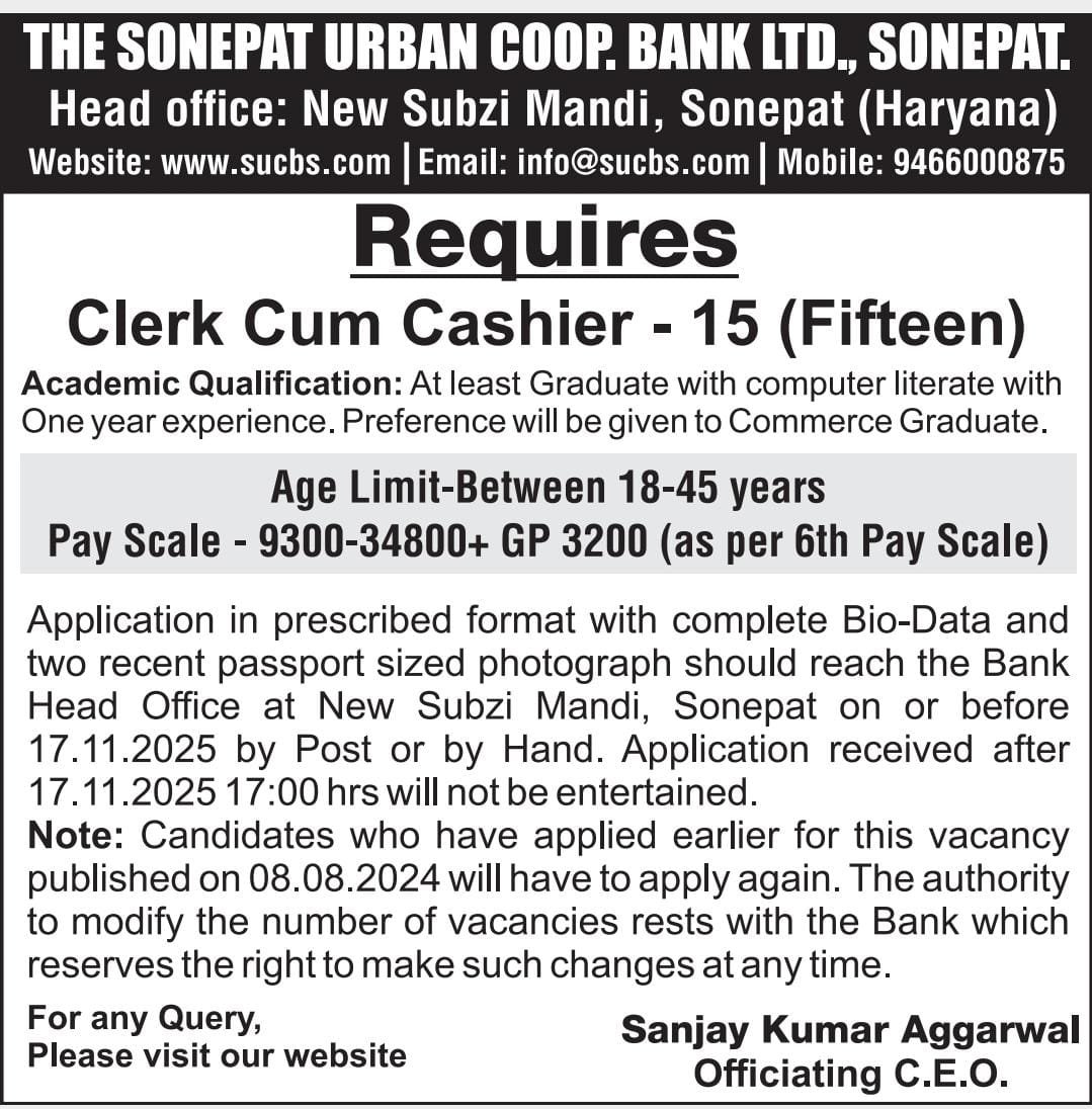 | Sonipat Cooperative Bank Clerk Vacancy 2025 Notice | Official Notice |
