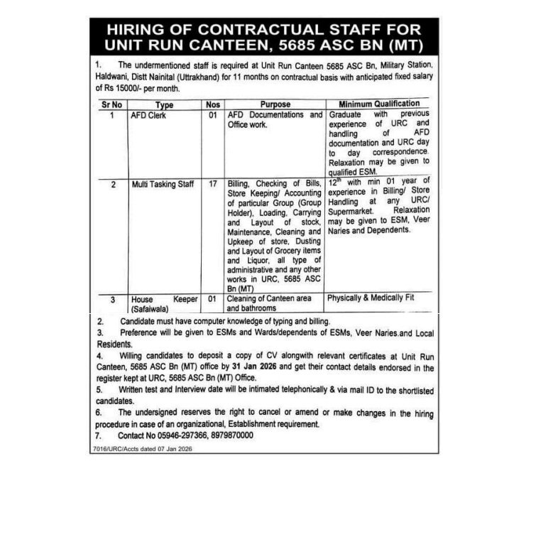 Unit Run Canteen Haldwani Vacancy 2026 : Unit Run Canteen, 5685ASC BN (MT) Military Station, Haldwani, Distt. Nainital (Uttrakhand) issued the latest notification for the post of Clerk, MTS and Safaiwala. Interested Candidate can apply through Sending/ Submitting their application form via By Post or By Hand. All details related to Unit Run Canteen Haldwani Bharti 2026 are given below in this post.
