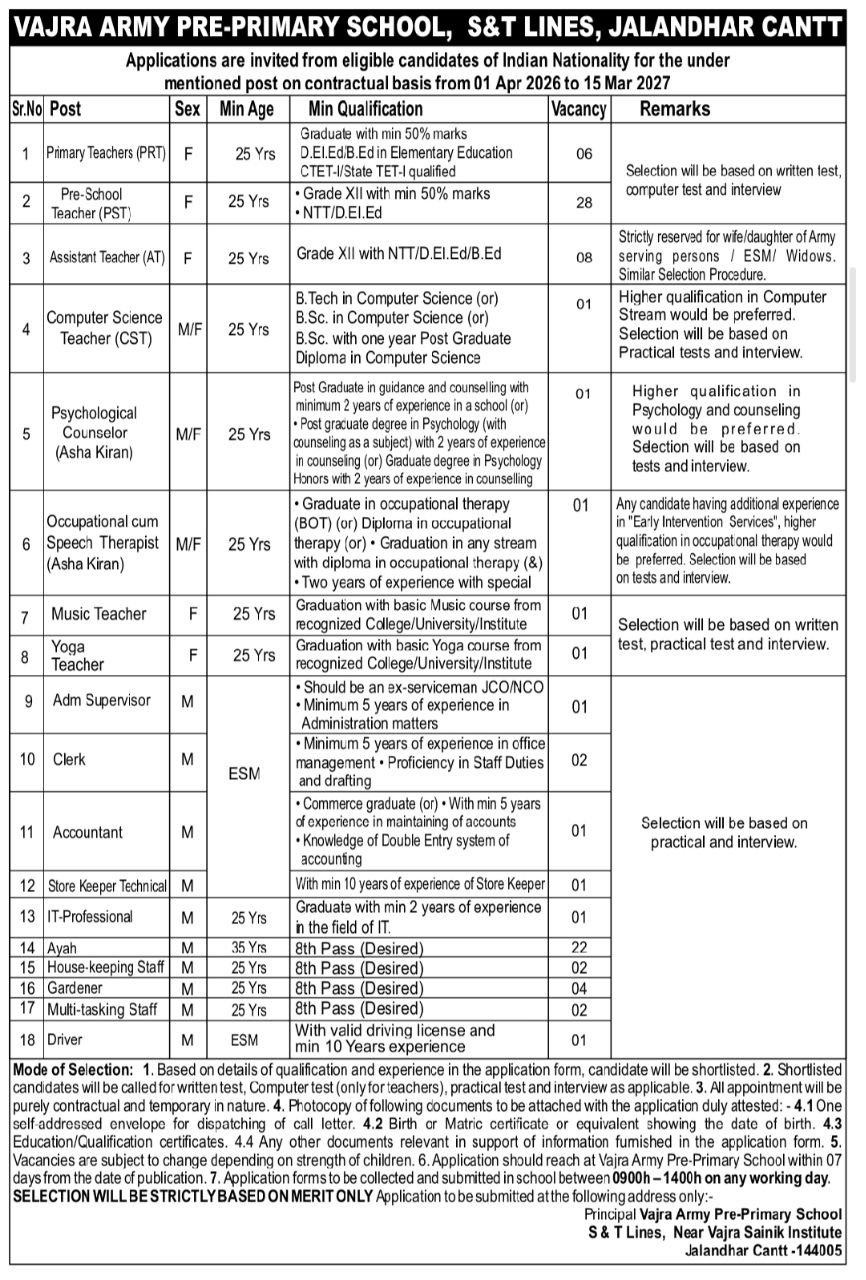VAPPS Jalandhar Cantt Vacancy 2026 : Vajra Army Pre-Primary School (VAPPS), issued the latest notification for the post of Ayah, Clerk, Driver and Various other. Interested Candidate can apply through Sending/ Submitting their application form via By Post or By Hand. All details related to VAPPS Jalandhar Cantt Vacancy 2026 are given below in this post.