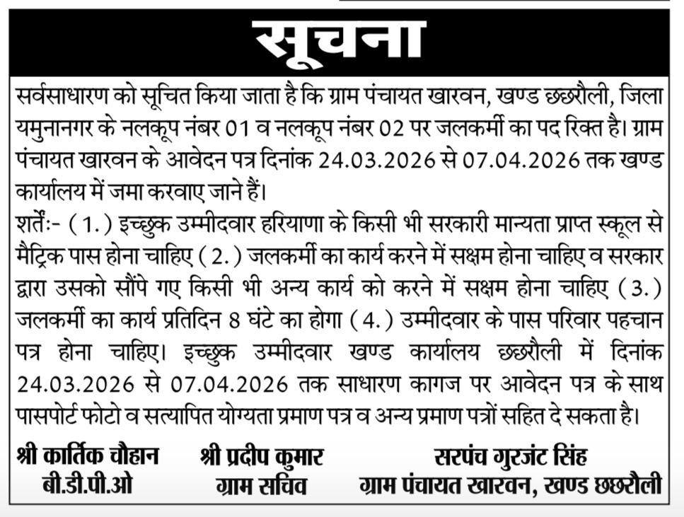 Yamuna Nagar Tubewell Operator Vacancy 2026 Notice  Official Notice